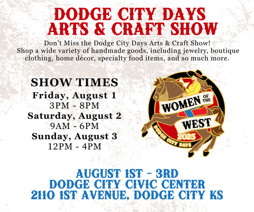 Beat the heat and bring your family to the Dodge City Civic Center and browse through all of the booths filled with unique arts and crafts. Vendors from all over the United States will be showcasing their goods for 3 full days! Show runs from Friday, July 31st - Sunday, August 2nd. For more information go to dodgecitydays.org, email dcdays@dodgechamber.com or call (620) 227-3119.