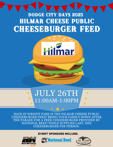 Back in Wright Park is the Hilmar Cheese Public Cheeseburger Feed! Bring your family down after the parade for a free cheeseburger! While supplies last, one cheeseburger per person. A 2026 Dodge City Days lapel pin is required for entry into the park. Please leave your pets at home.